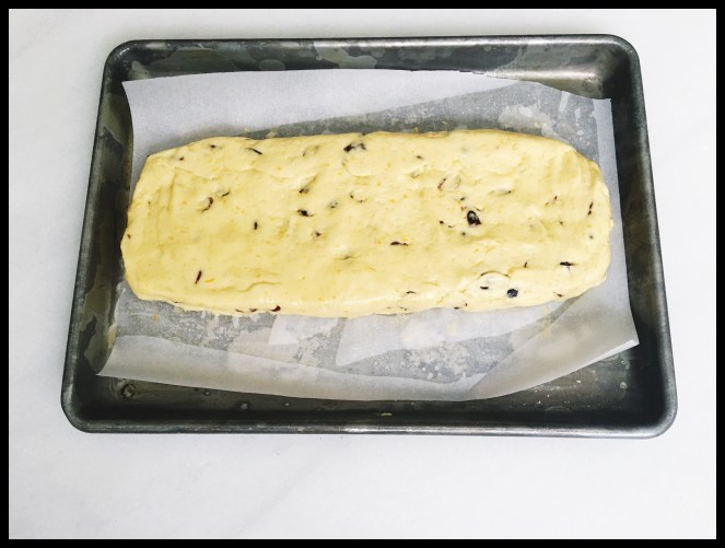 10. Bake biscotti log for approximately 12 minutes, depending on how true to temperature your oven is, or until slightly golden brown on top.