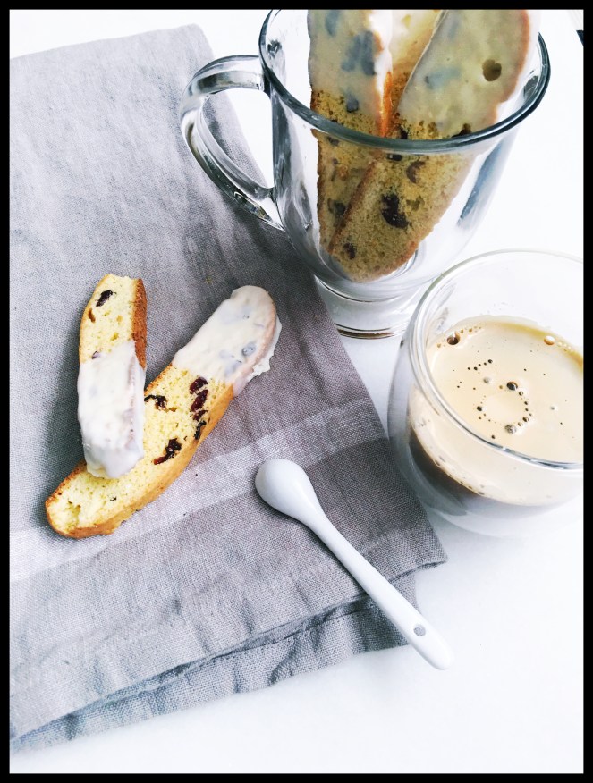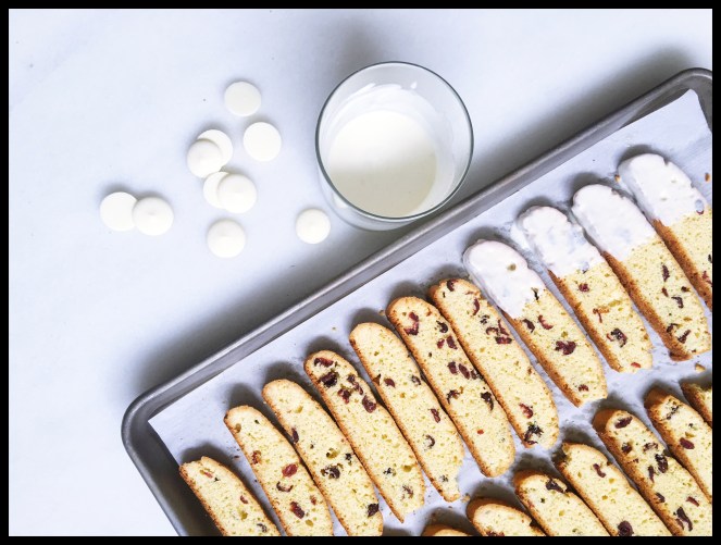 15. The biscotti are officially twice baked and ready to enjoy, but for an extra dose of sweetness I like to dip one end in white chocolate once they’re cool. If you are going to keep them around for a couple of days to have with coffee or give them as a gift, and you don’t know how to temper chocolate, I would suggest melting one or two teaspoons of shortening with the white chocolate. Shortening is solid at room temperature and will help the chocolate coating stiffen up and grasping hands won’t get as messy!