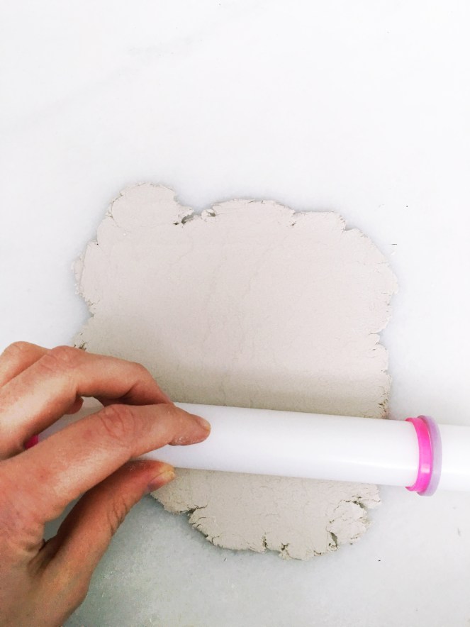 Roll the clay out to about 1/8″ thick. The clay will not look perfect at first. There will be cracks and assorted ugliness, but it will smooth out as you roll it thinner, don’t worry!