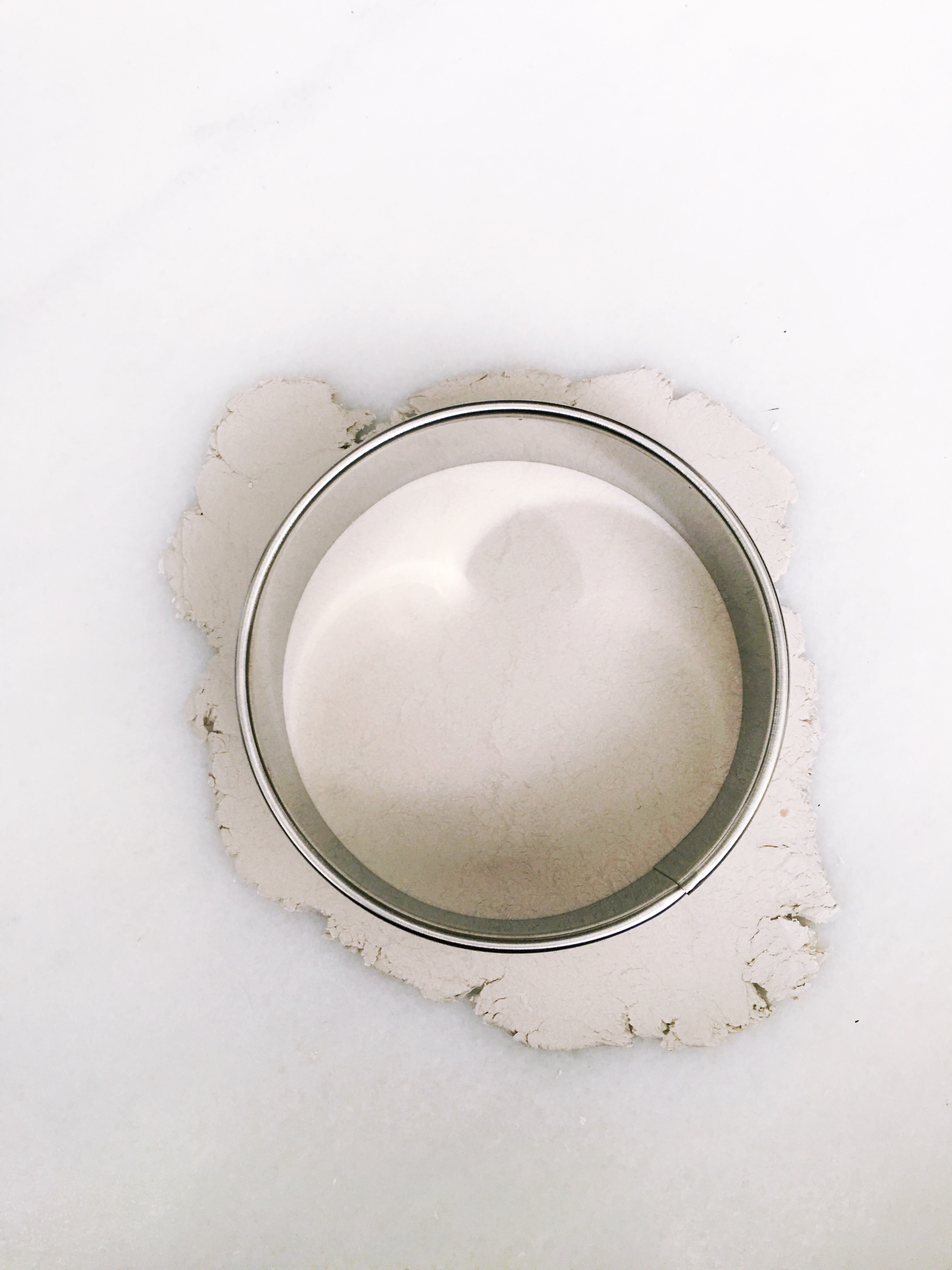 Using the 3 1/2″ round cutter, cut a circle out of the rolled out clay. Discard the scraps. (If you want to save them for another project, make sure you wrap them in plastic right away or they will begin to dry out and be useless in the future.)