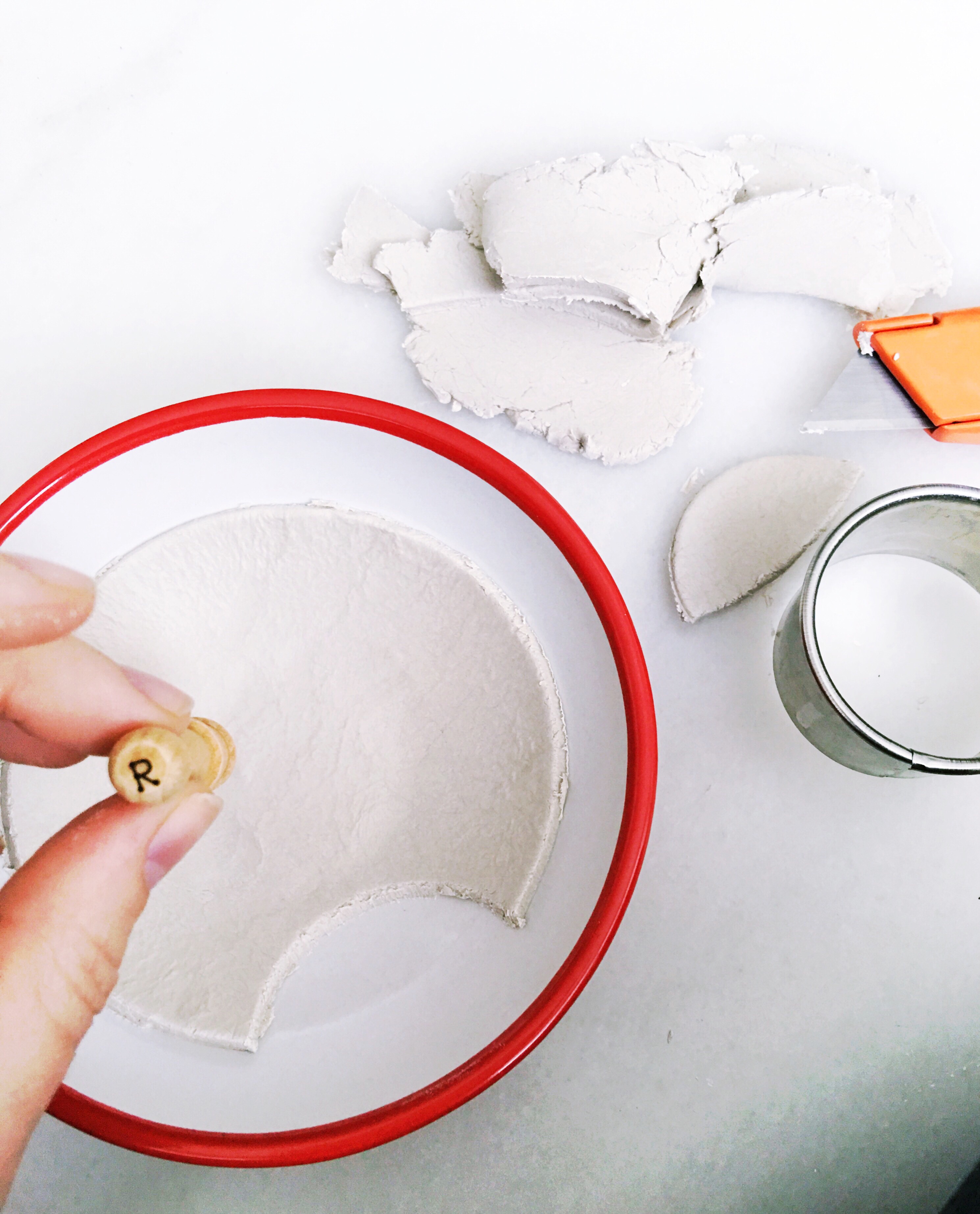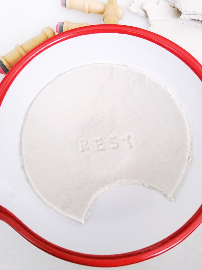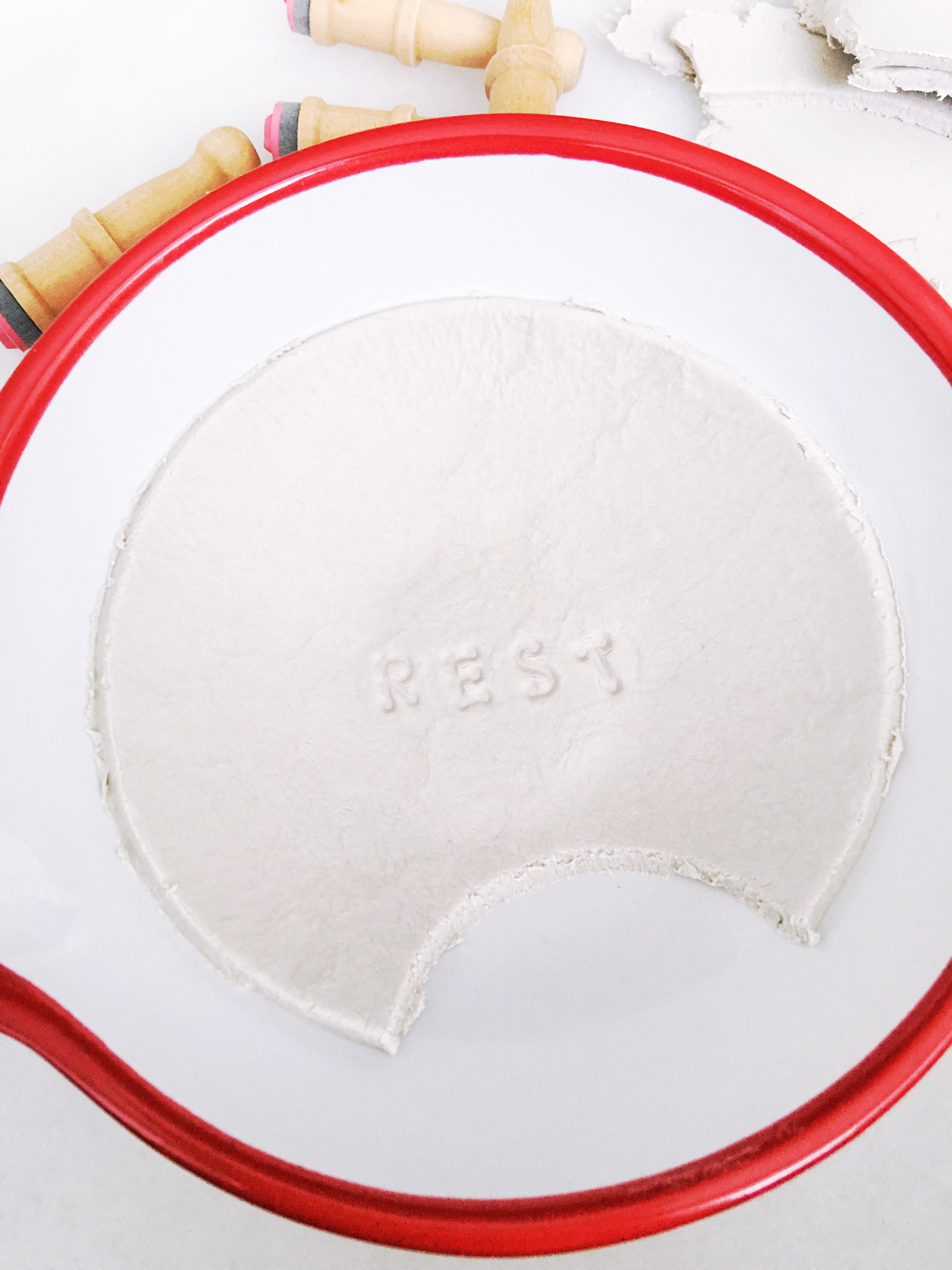 Using your letter stamps, press a message into the bottom of your clay round. I stamped rest into mine, but you could use spoon or any other short word that will fit.