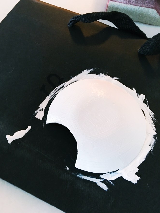 Turn over the bowl and paint the backside as well. Since you haven’t painted the edges of the bowl, it shouldn’t stick to the paper too bad. Once dry, repeat the process as many times as you feel it needs to have an even, bright white coat.