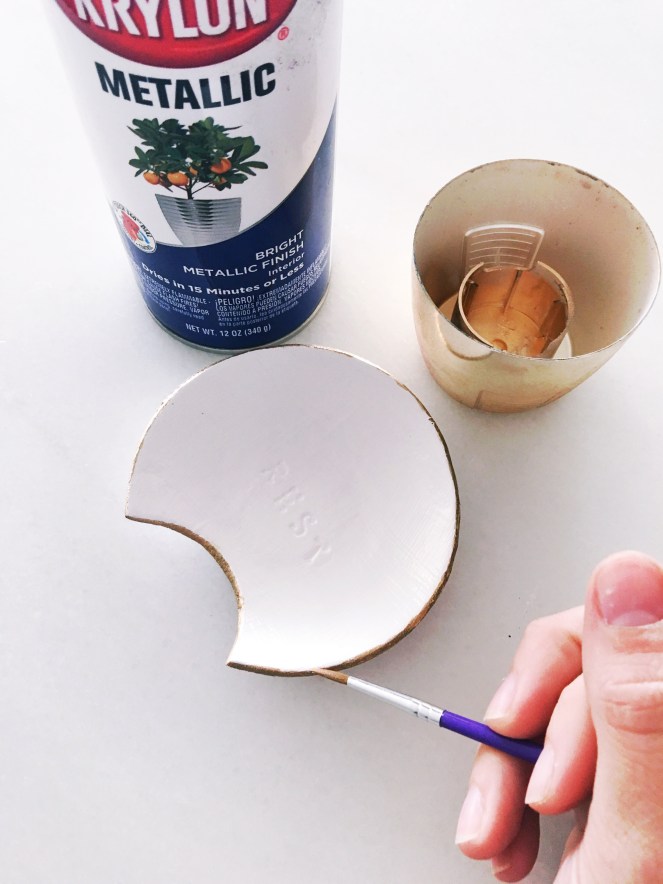 Using a small paintbrush, use your gold paint to carefully paint the edges of your bowl. You want to paint the edges of the cutout area of your bowl as well. Allow to dry fully.