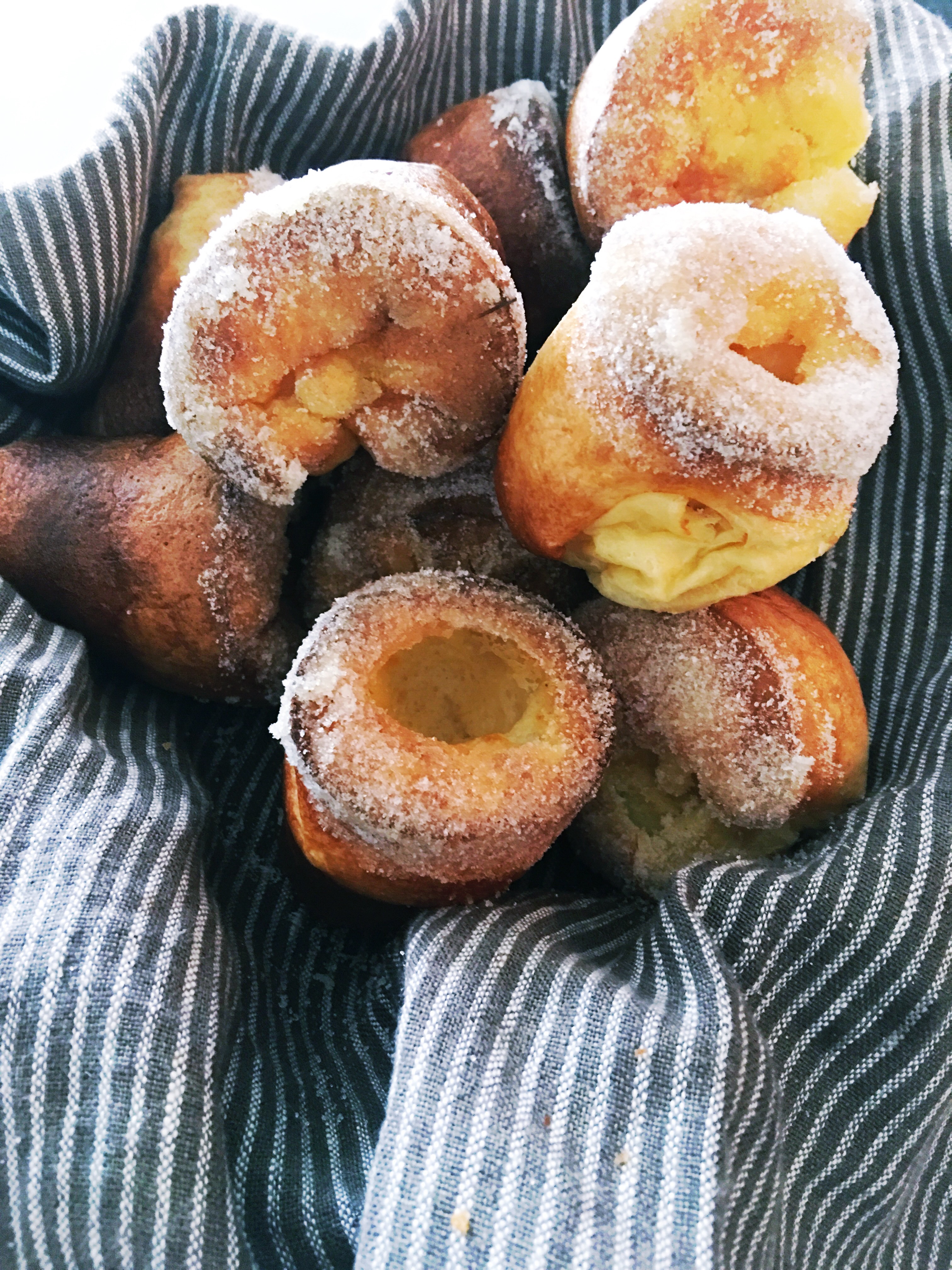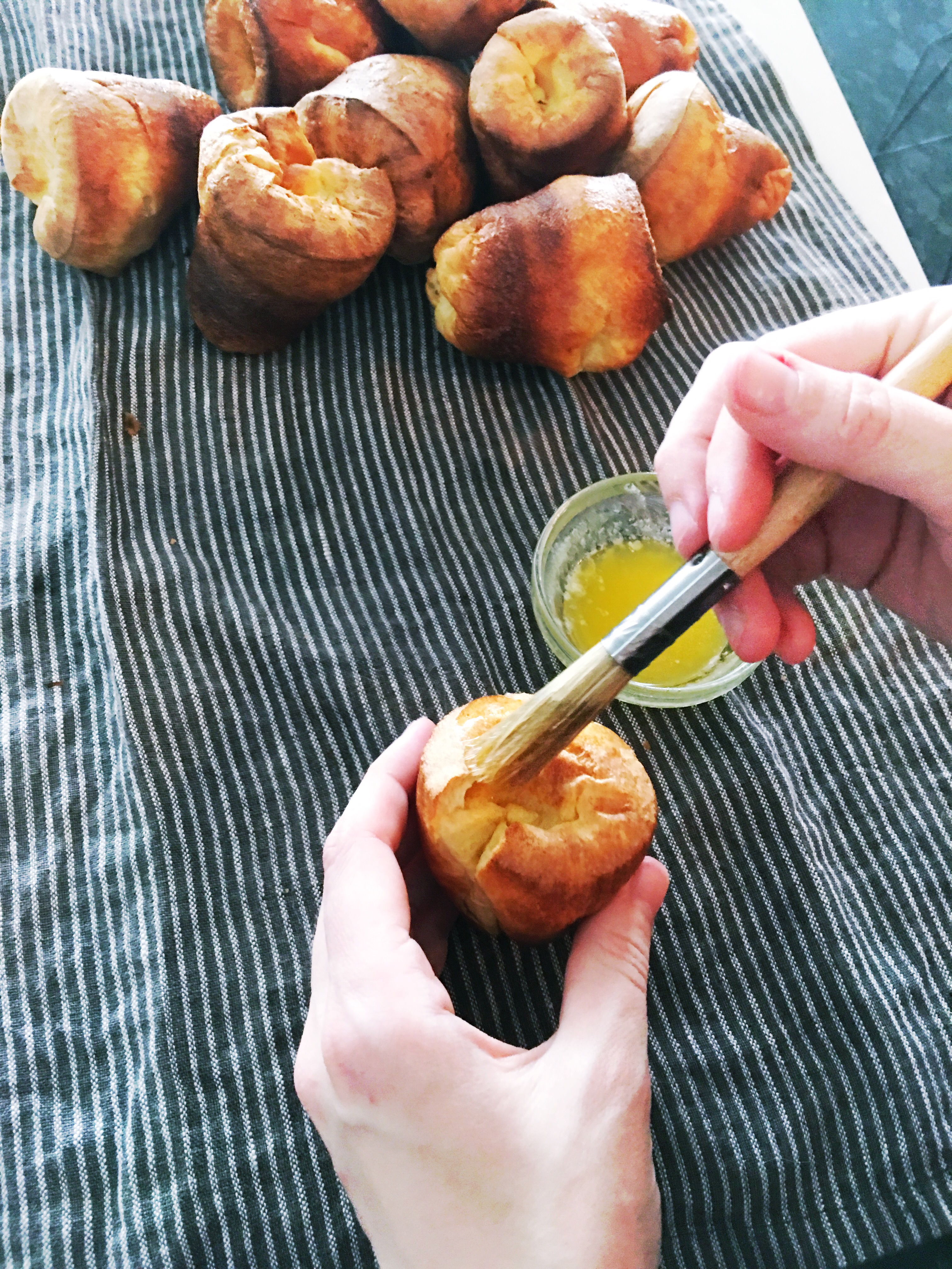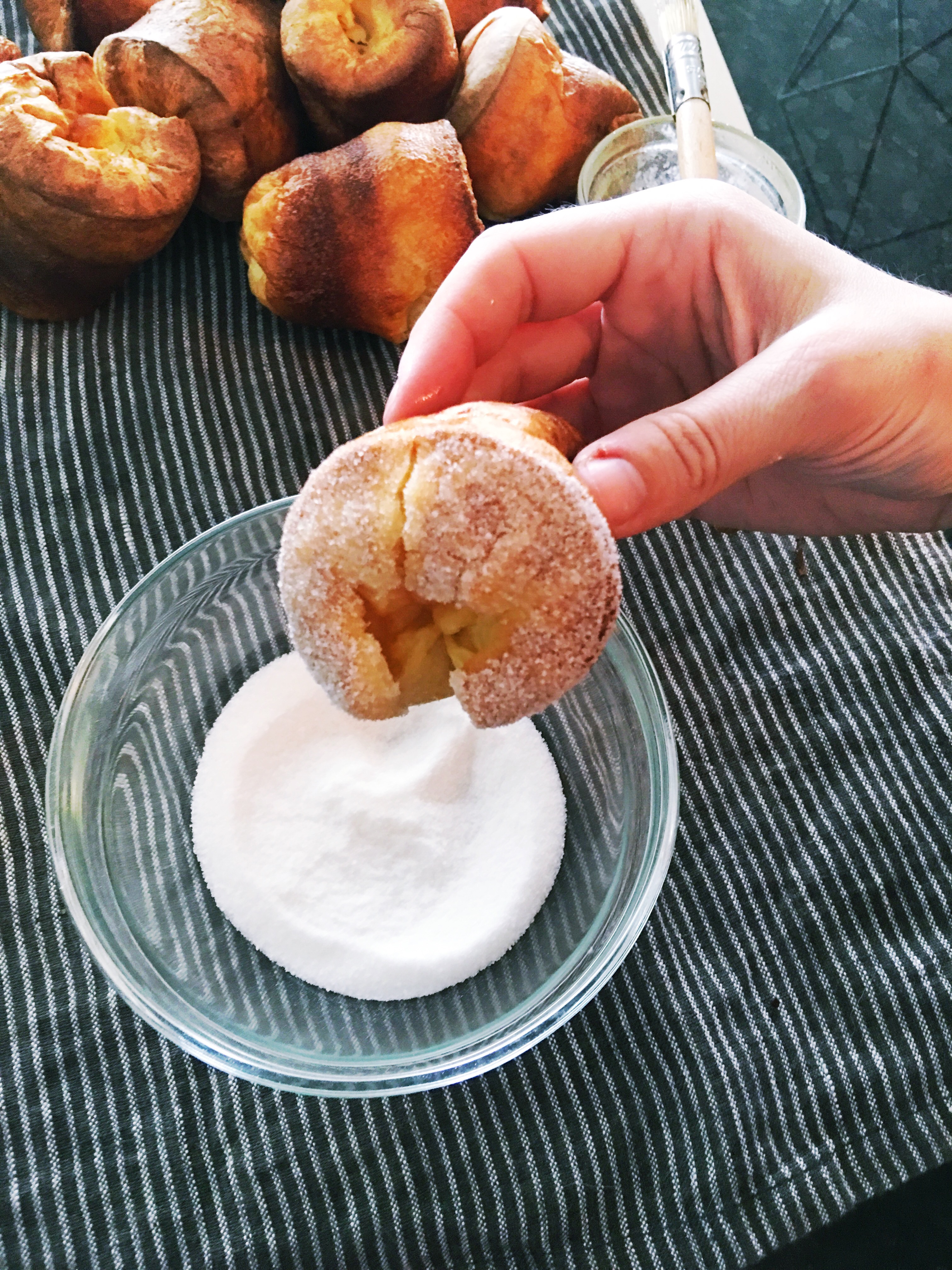 9. Brush the melted butter onto the top of each popover (or the whole darn thing if you prefer!) and coat with the second measure of granulated sugar.