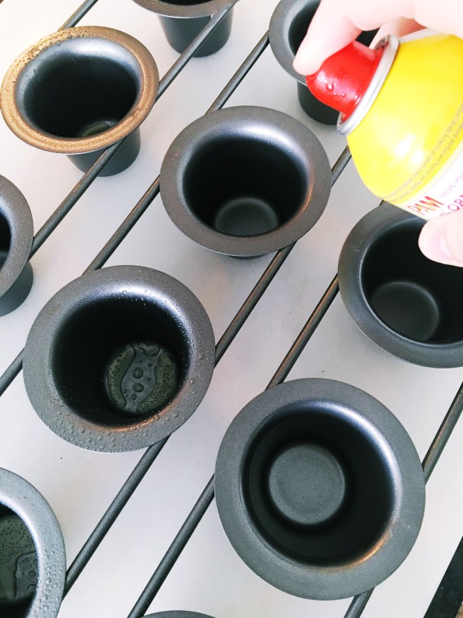 5. Remove popover pan from oven and liberally coat with cooking spray.