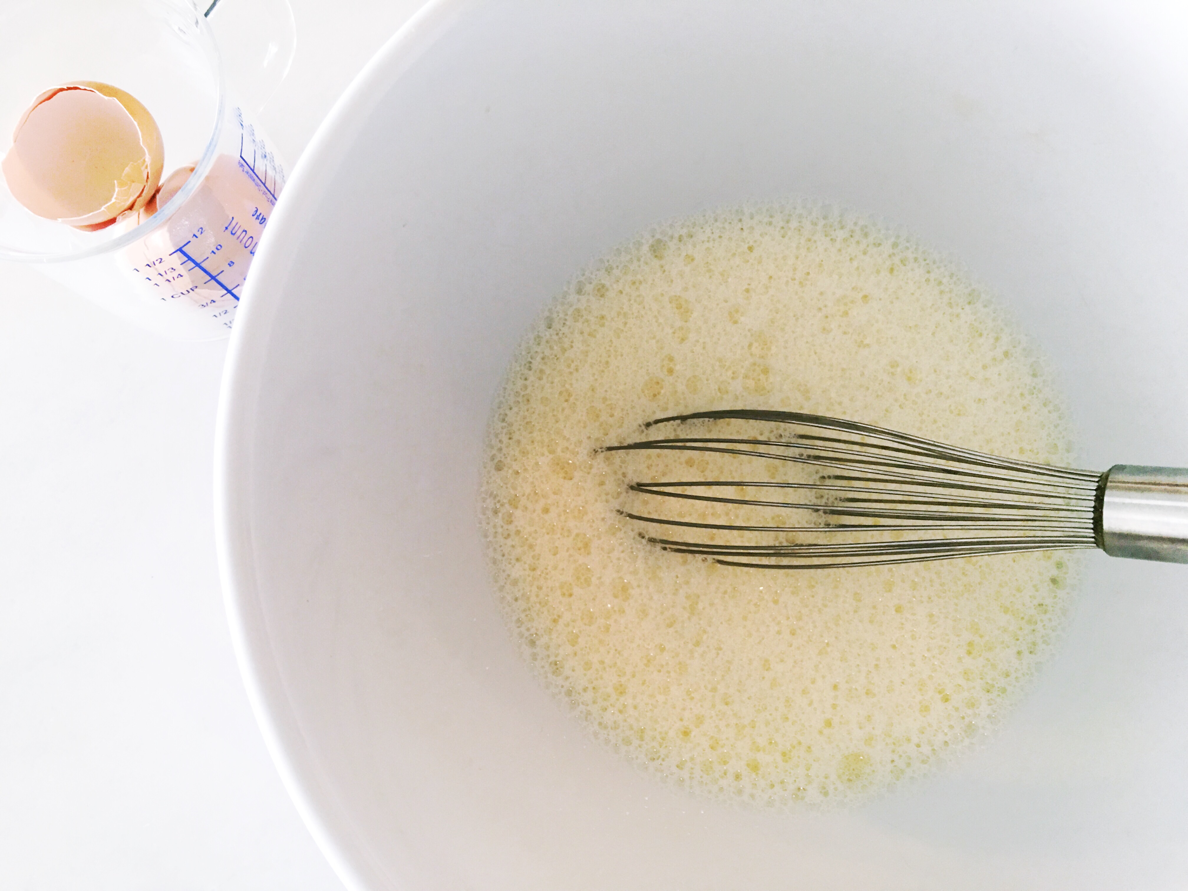 4. Mix flour, salt and sugar together and add to egg mixture. Using your whisk, combine everything together. If there are a few small lumps in the batter, that is totally acceptable. There should still be lots of bubbles in the finished batter.