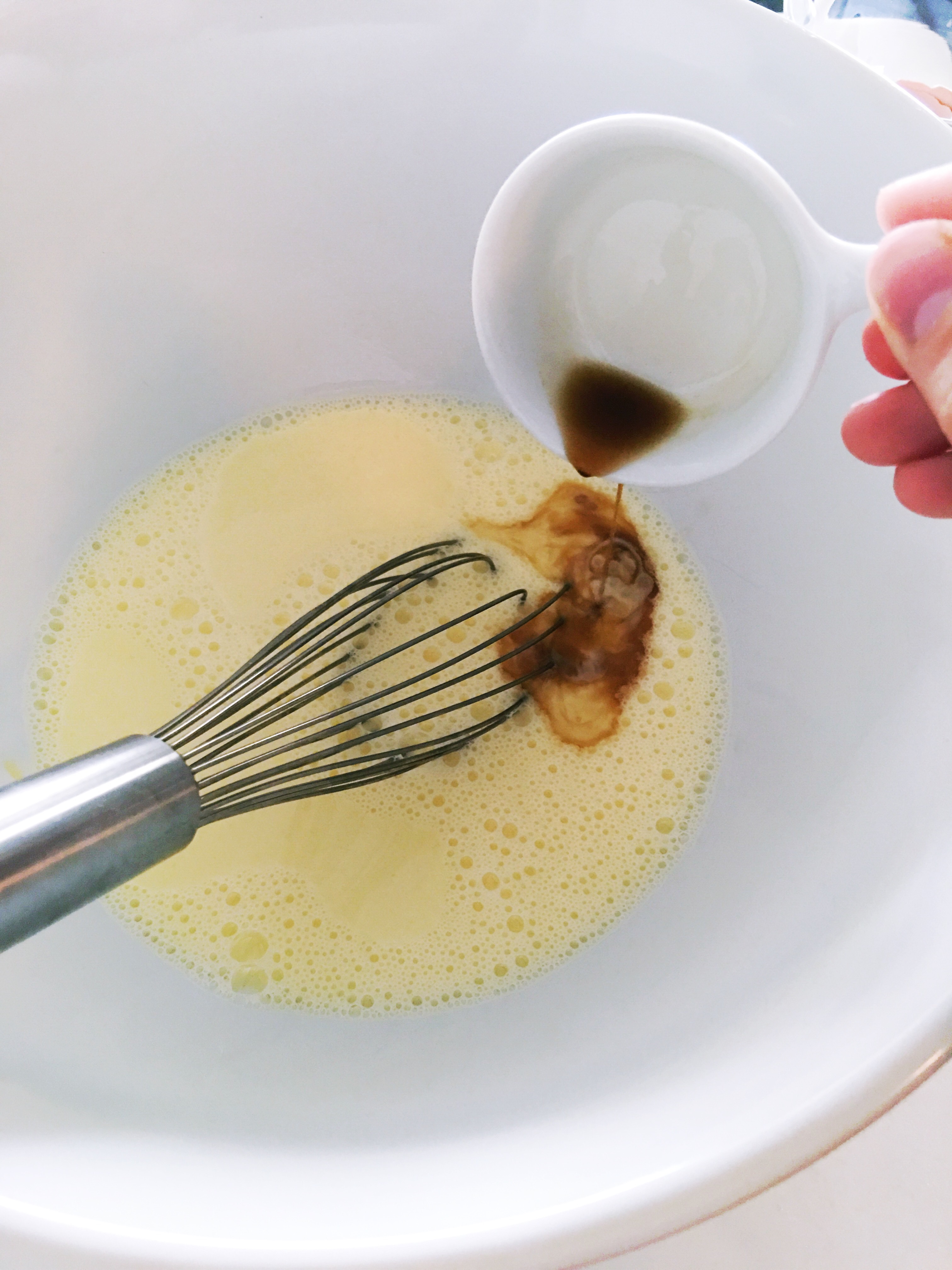 3. In a large bowl, whisk together eggs and milk. Add vanilla and whisk until mixture is very foamy, about 1 minute. You want to incorporate a lot of air into the batter.