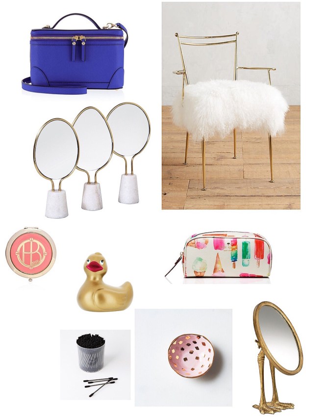 Clockwise from top left: Henri Bendel West 57th Train Case, Anthropologie Shag Puff Dressing Chair, Kate Spade Cedar Street Ice Pop Berry Makeup Bag, Rejuvenation Mallard Mirror, Suite One Studio Confetti Mini Bowl, Muji Black Cotton Swabs, Upper Canada Soap Couture Rubber Duck Gold, Henri Bendel Monogram Compact Mirror, Kathy Kuo Home Evyn Regency Round Brass & Marble Vanity Mirror