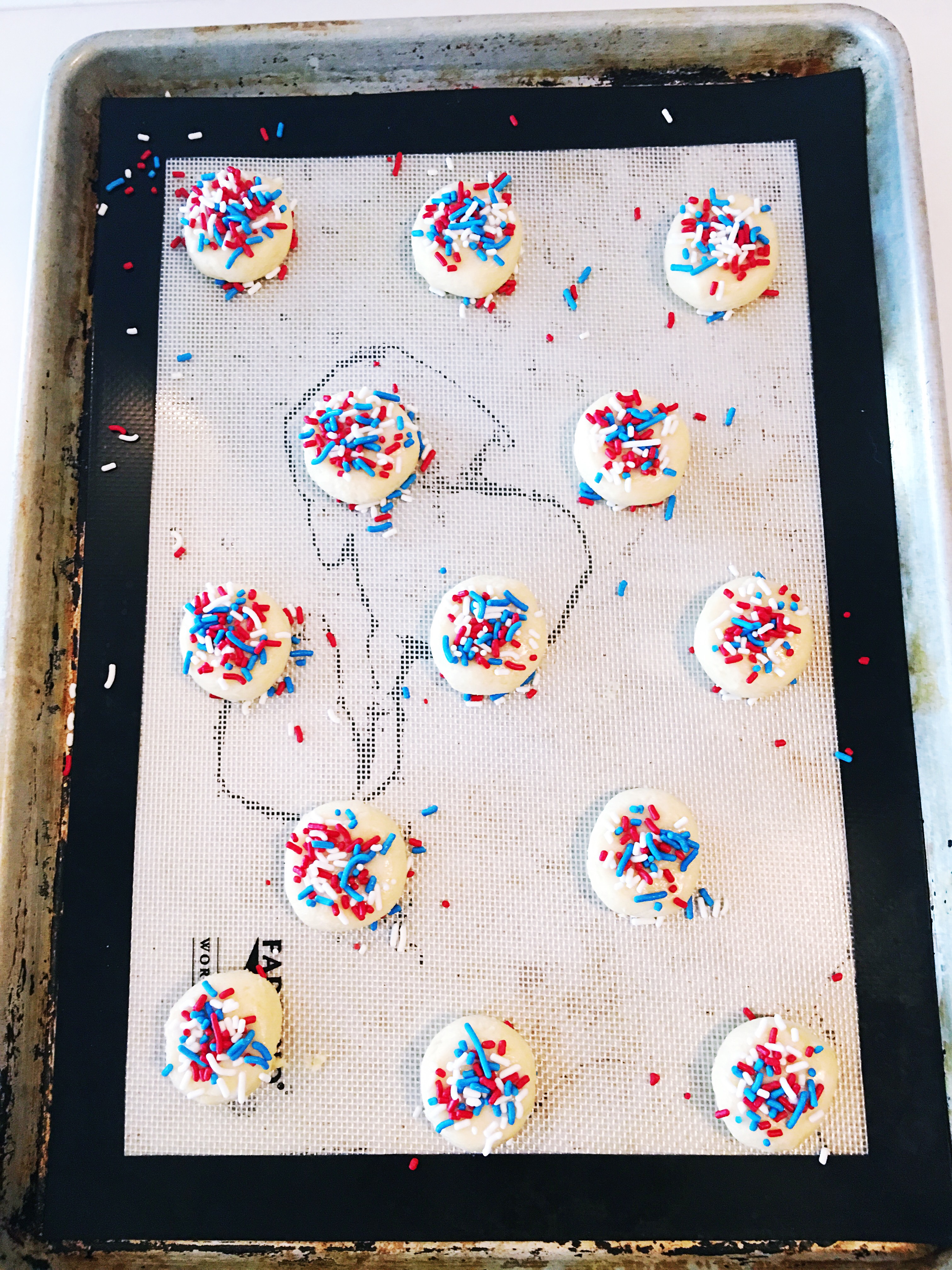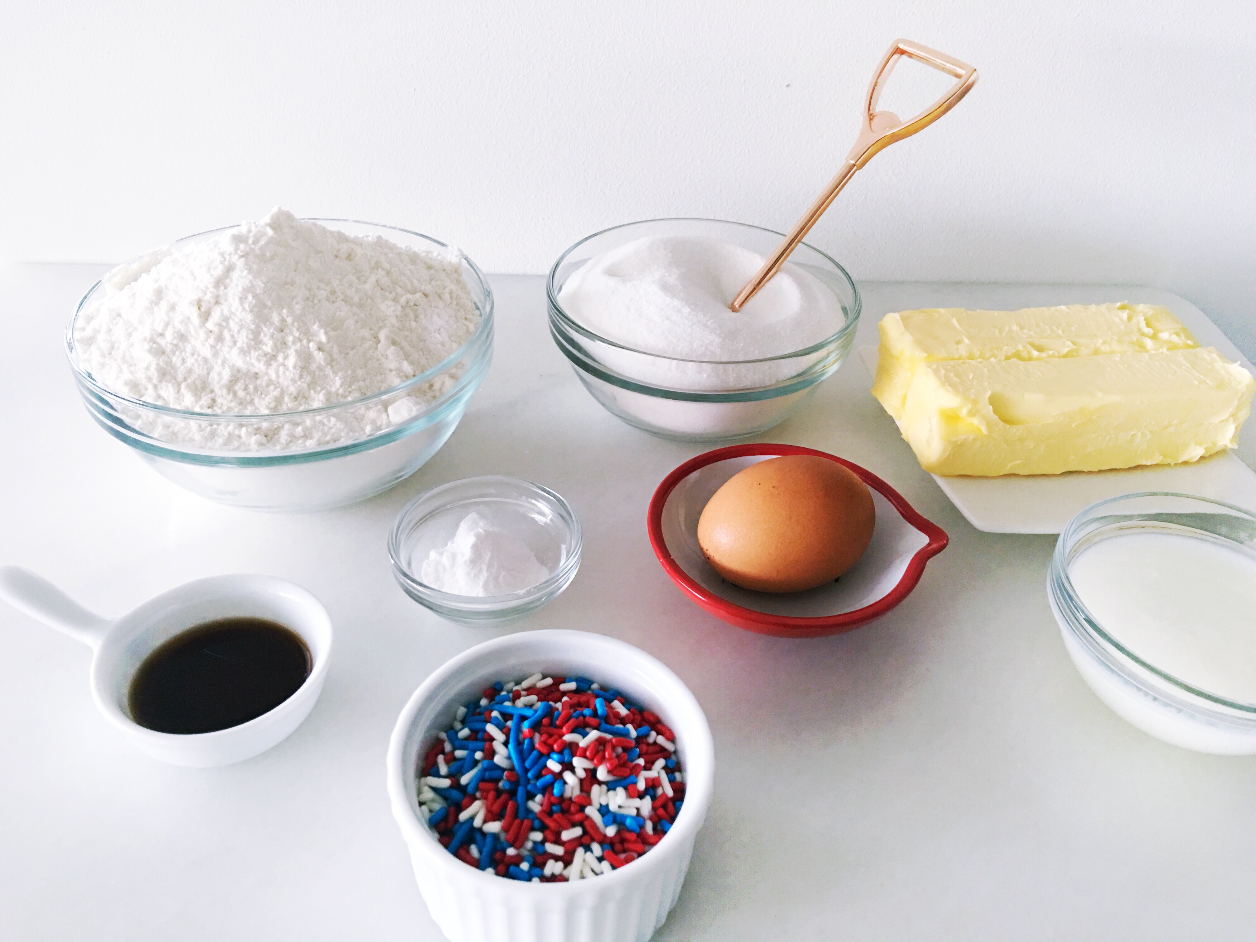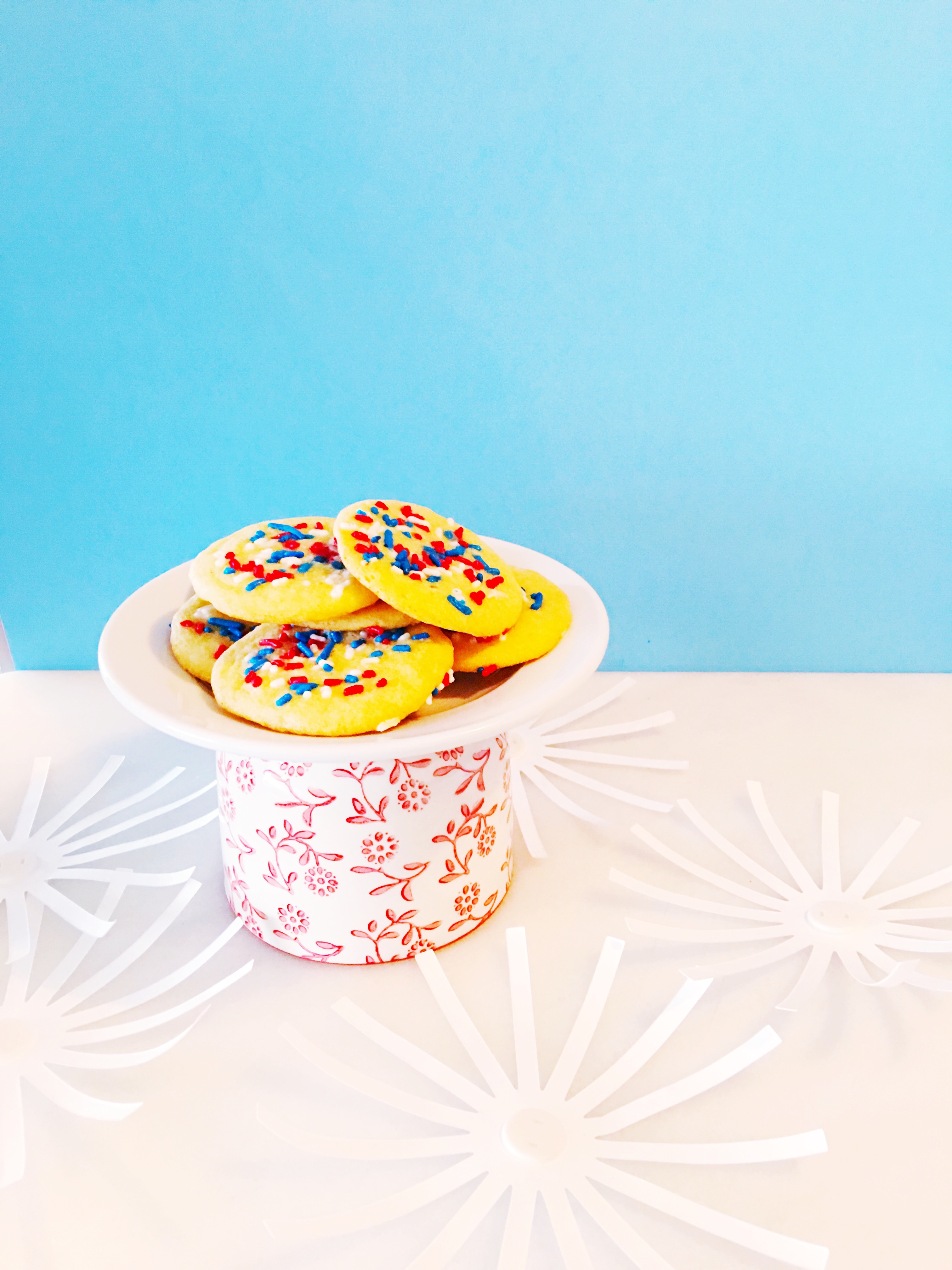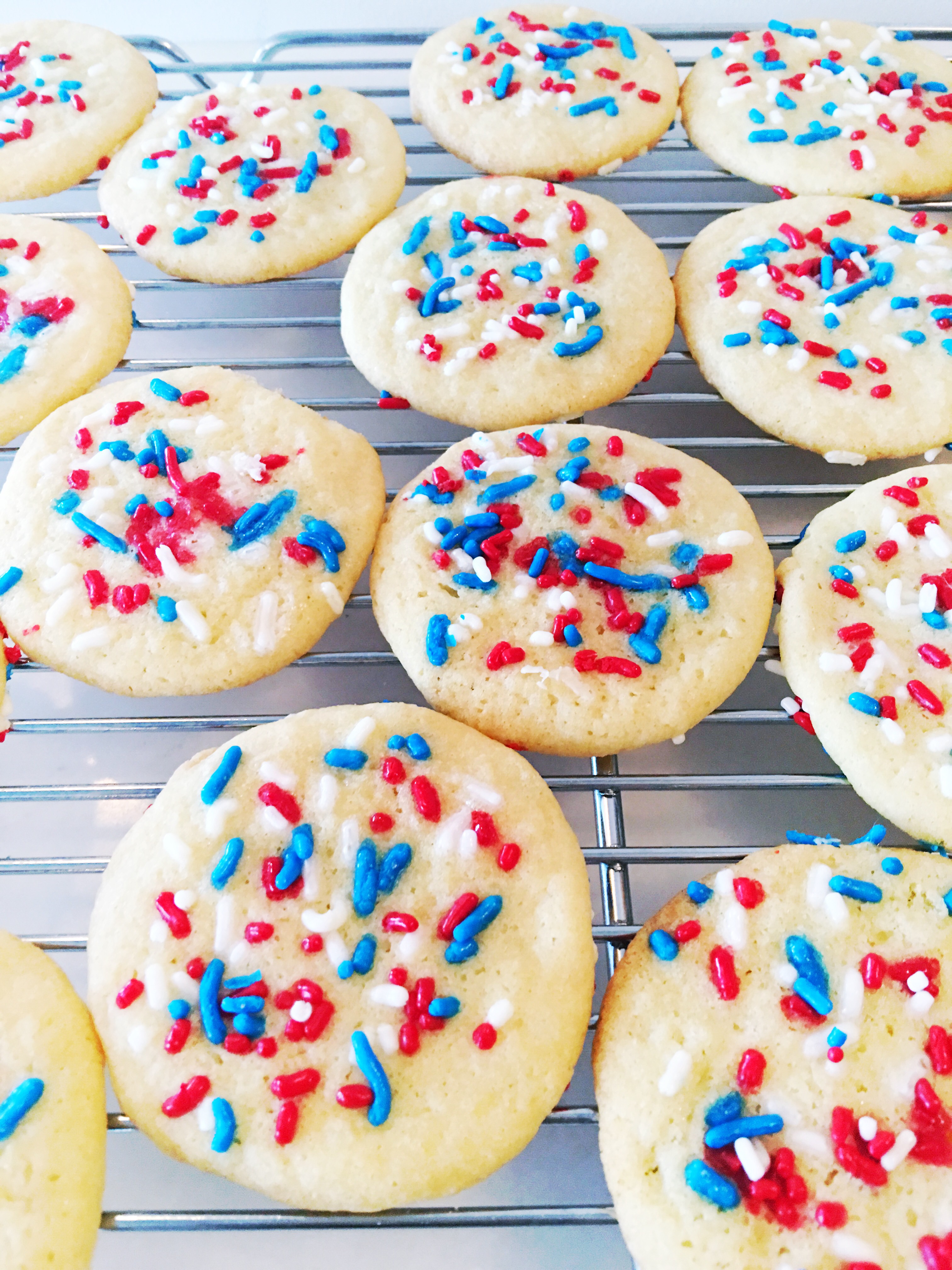 So this recipe may seem a little preemptive, considering how far away the 4th of July is, but I only had red, white and blue sprinkles at my disposal when I decided to whip these up, so work with me. Obviously, you can use a more season-appropriate sprinkle mix, or sanding sugar, or leave the topping off completely, and still enjoy these cookies. Don’t get me wrong, I love all cookies. Flavor, size, shape, filling, topping; it doesn’t matter, I love them all. That being said, when I’m feeling particularly low or lazy or down, I crave a box of the chewy sugar cookies they sell at my local grocery store. They’re not too sweet, go perfectly with a glass of cold milk, and, for me, are a perfect comfort.