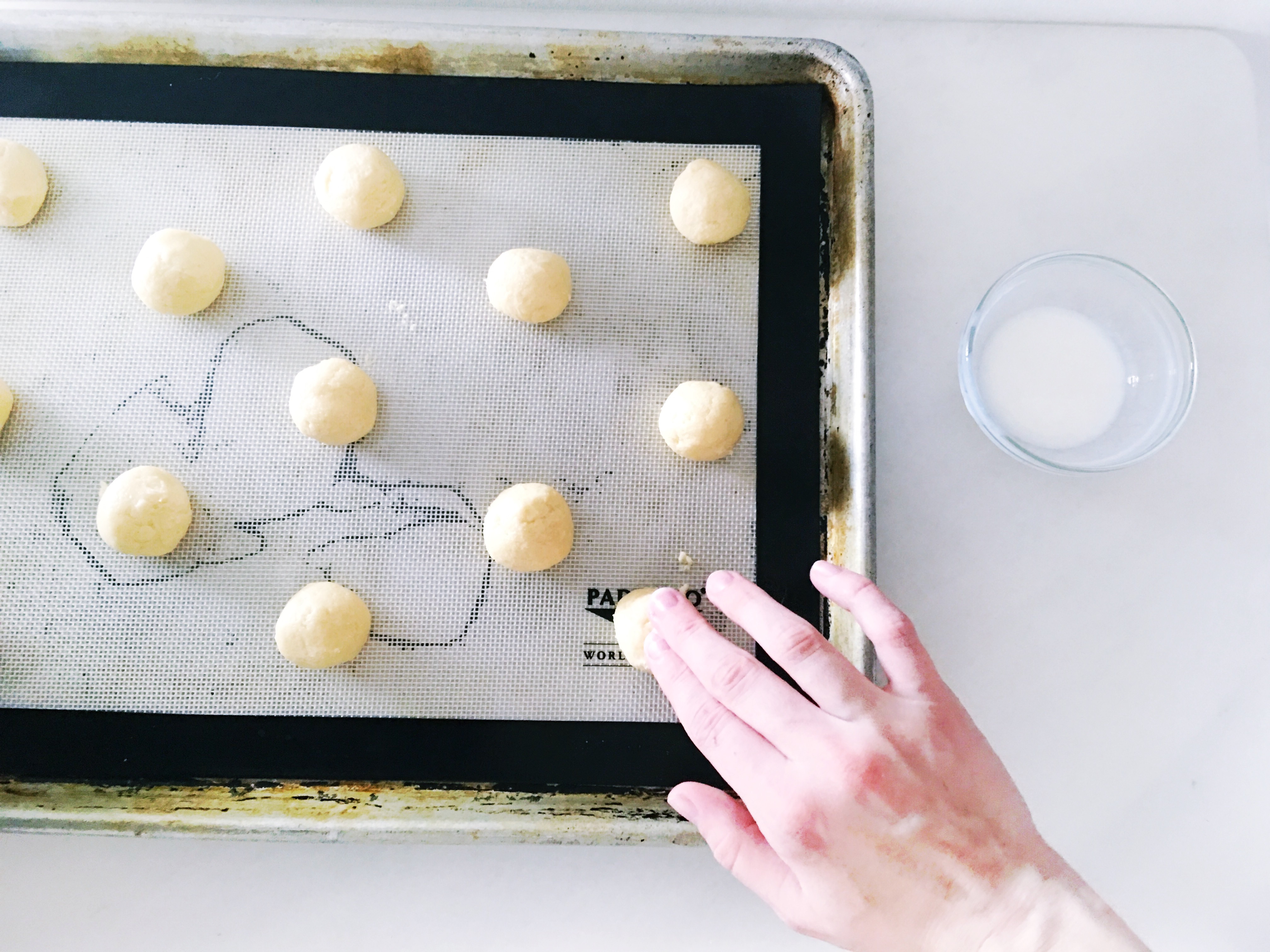 6. Roll the dough into large teaspoon-sized balls and arrange on ungreased sheet pans, leaving 2″ between each one. (I lined my pans with SilPats. Alternatively, you could also use parchment.)