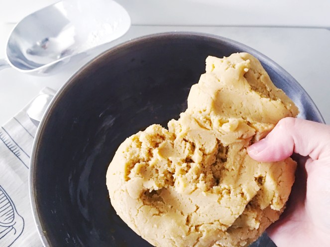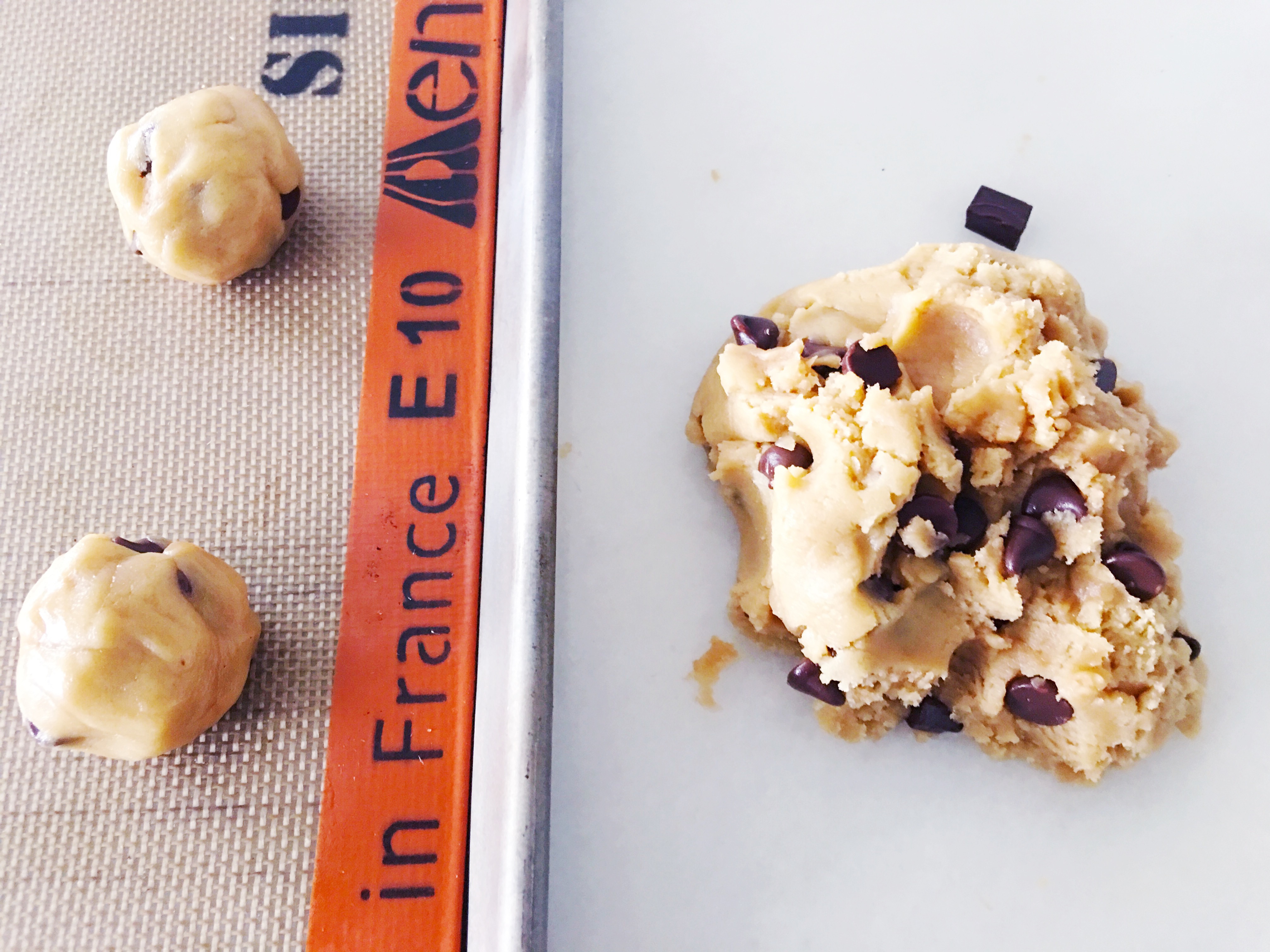 4. Add in the flour, baking soda and salt and mix just to combine. (If you mix too much at this stage, the cookies will become tough.) You should be able to pick up the dough at this point and not have a sticky mess on your hands. If your dough is still a little wet, add more flour one tablespoon at a time until the desired consistency is reached.5. Add your chocolate chips and mix them in by hand until evenly dispersed throughout the dough. 6. Roll tablespoon-sized pieces of dough into balls and arrange on parchment or SilPat-lined sheet trays, allowing 2″ between each cookie.7. Bake cookies for 8-12 minutes, depending on your oven, until they appear dry on the outside. They will remain pale, so don’t wait for them to turn golden before you pull them or they will be overdone.8. Allow cookies to cool completely (if you can) and enjoy with a tall glass of ice-cold milk. See how nice and puffy they stayed! I was so excited when I pulled them out of the oven. And they don’t disappoint as a milk companion either! Their dense texture allows for maximum absorption and they retain all the buttery, brown sugary goodness of other variations of chocolate chip cookies. If you like cakey cookies, you should really try this recipe. And if you think you don’t, you should try it anyways! You may surprise yourself and find a new favorite midnight snack.