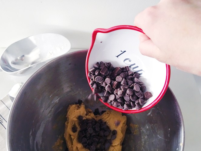 I figured if I was going to depart from my usual chewy cookies, I should really go for it. I wanted these cookies to be almost like mini chocolate chip cakes. I knew I would need to add more flour to my recipe, and the butter component would need to change. I ended up adding more flour and salt, and melting the butter completely before adding it to the recipe. The resulting cookies had the exact texture I was looking for, and remained tall and proud when baked. No melting down into flat pancakes for these treats! Oh no. They held up to the heat like champs and made me fall in love with chocolate chip cookies all over again. If you like cakey, dense, milk-stealing cookies, then these are for you!