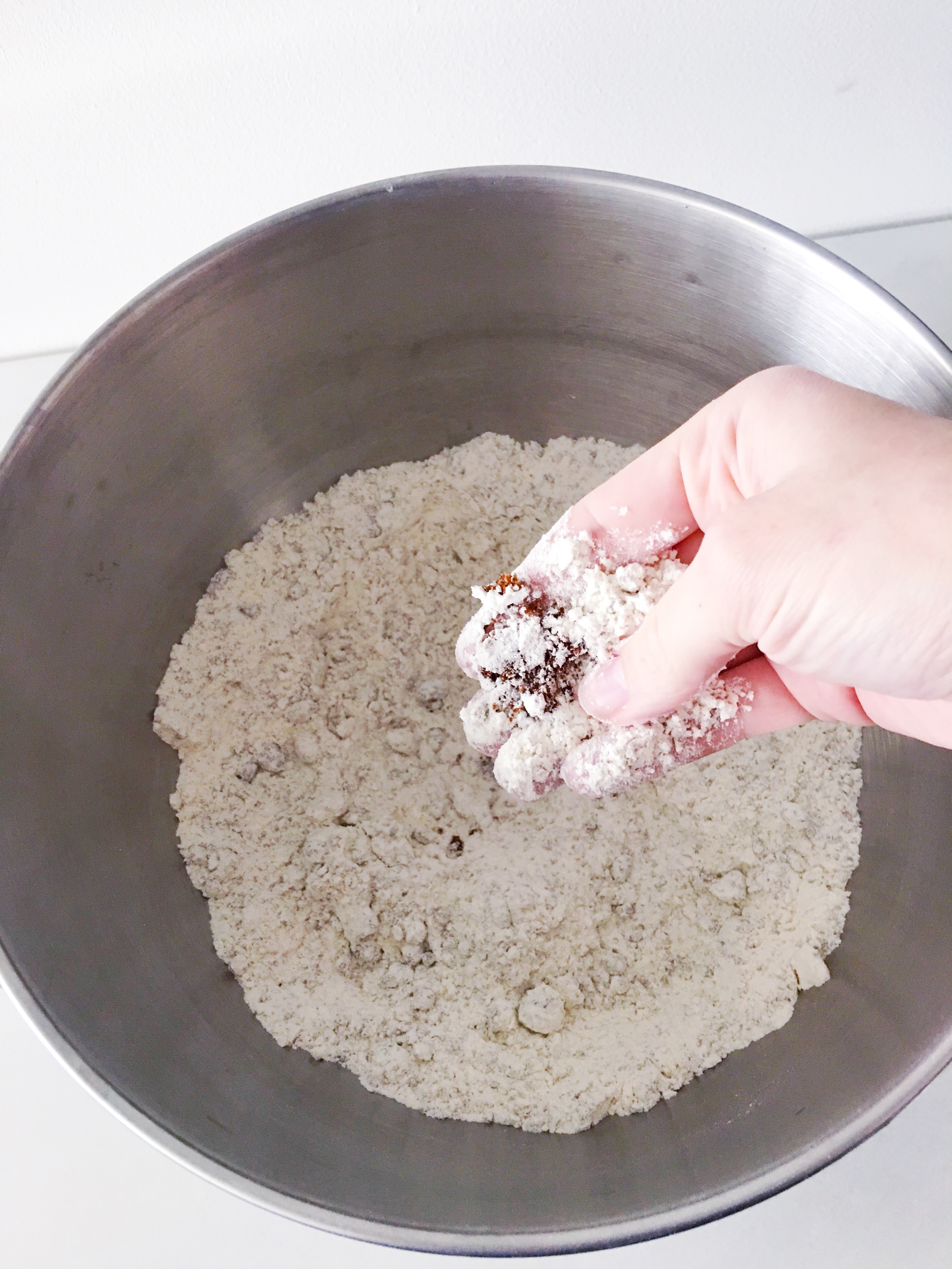 1. In the bowl of a standing mixer, combine the flour, sugar, baking soda and salt. Mix to combine and incorporate the sugar evenly. If you’re left with some lumps of sugar, just break them up between your finger and finish mixing them in.