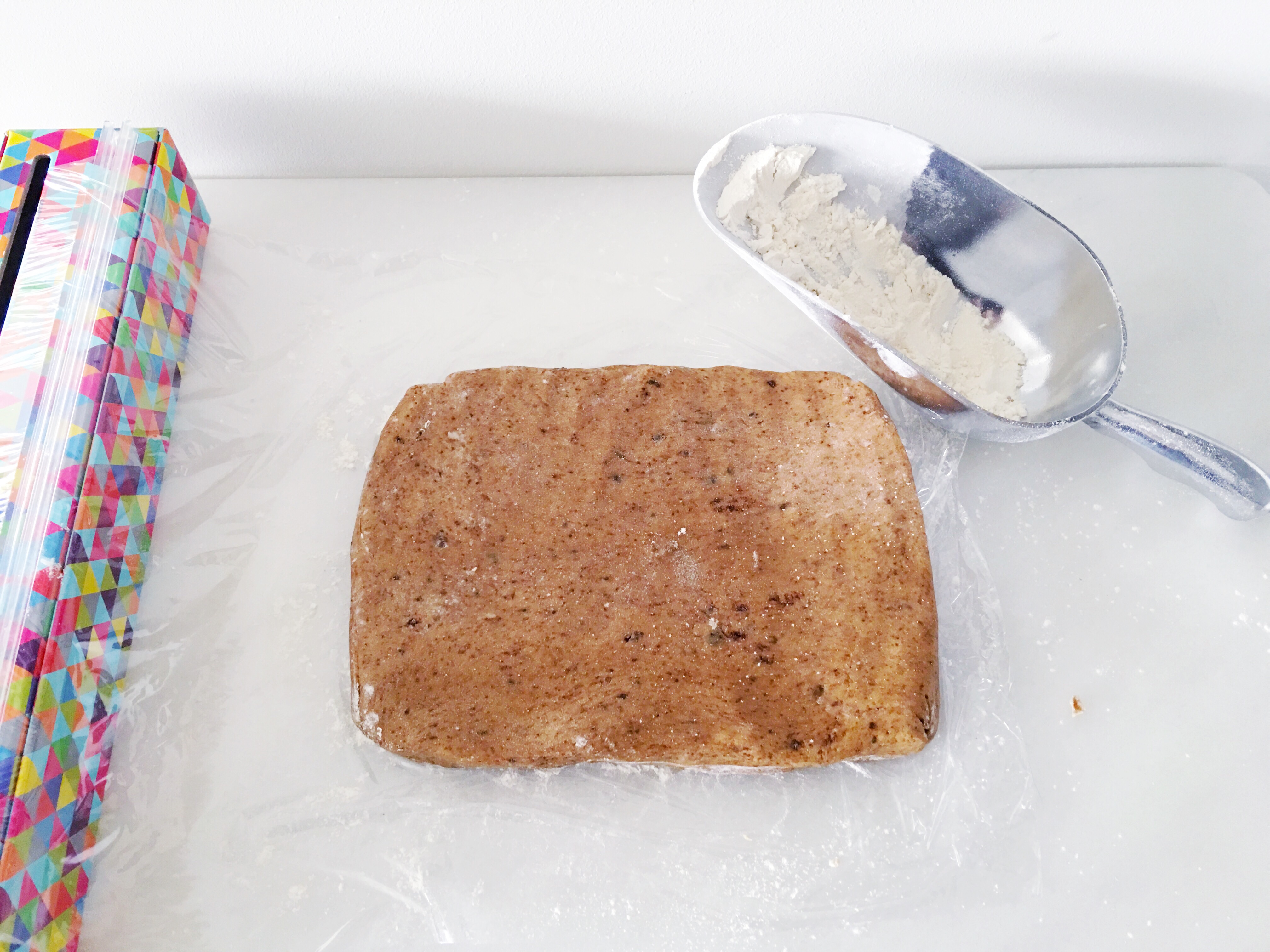 4. Dust a piece of plastic with a little flour and transfer the dough onto it. Pat the dough into a 1 inch tall rectangle and dust the top with a little more flour. Wrap up in plastic and refrigerate at least a couple of hours until firm. Alternately, you can freeze for about an hour.