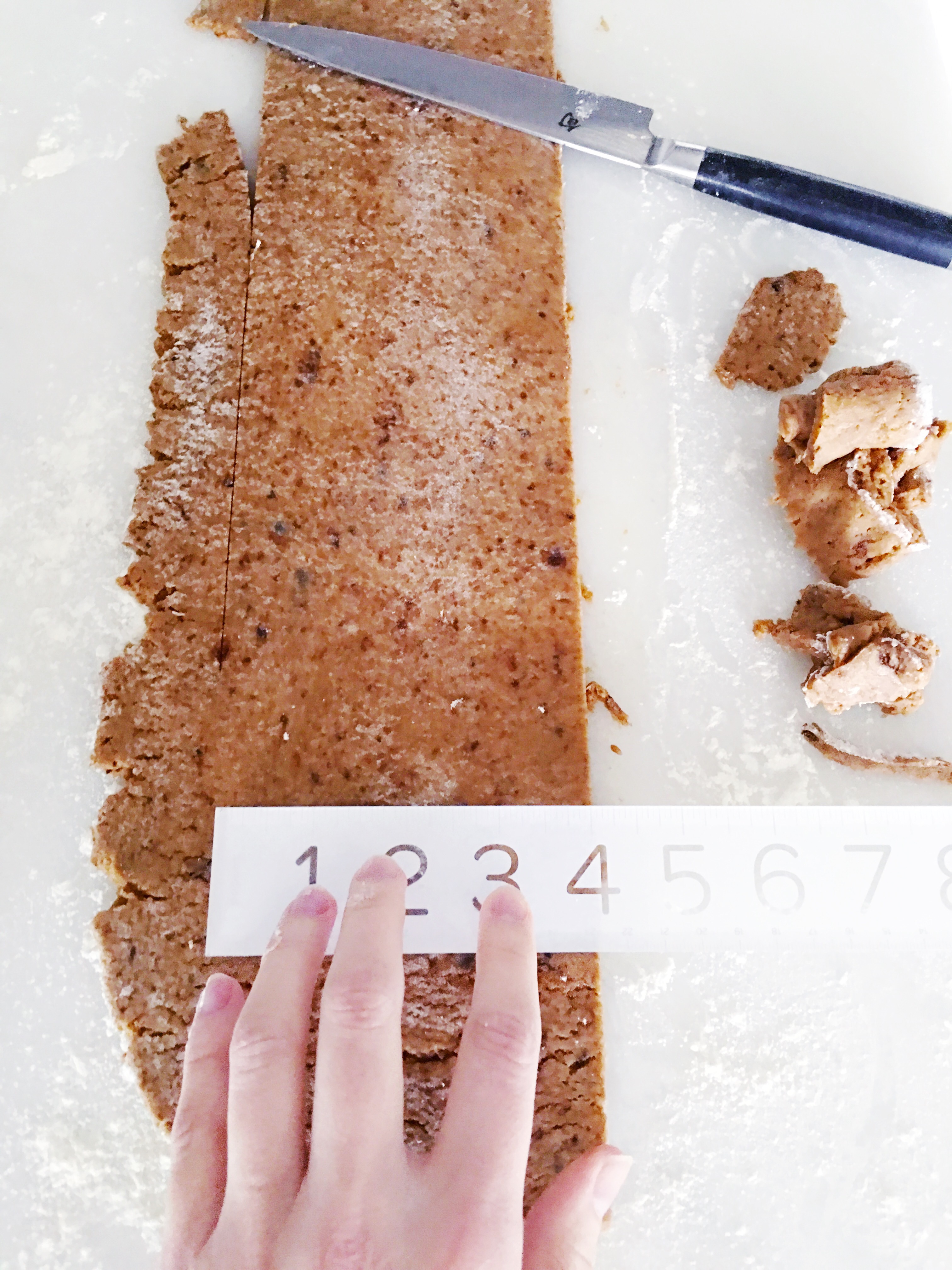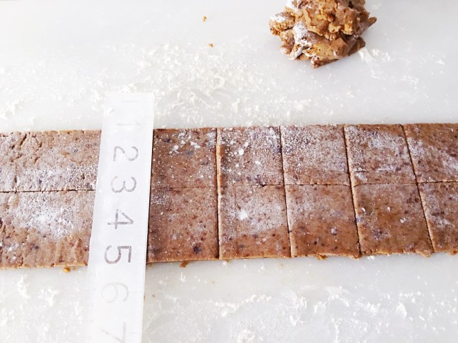 9. Cut these rectangles width-wise into 2 inch squares. (They will seem very small, but they expand to the size of regular Graham crackers when baked.)