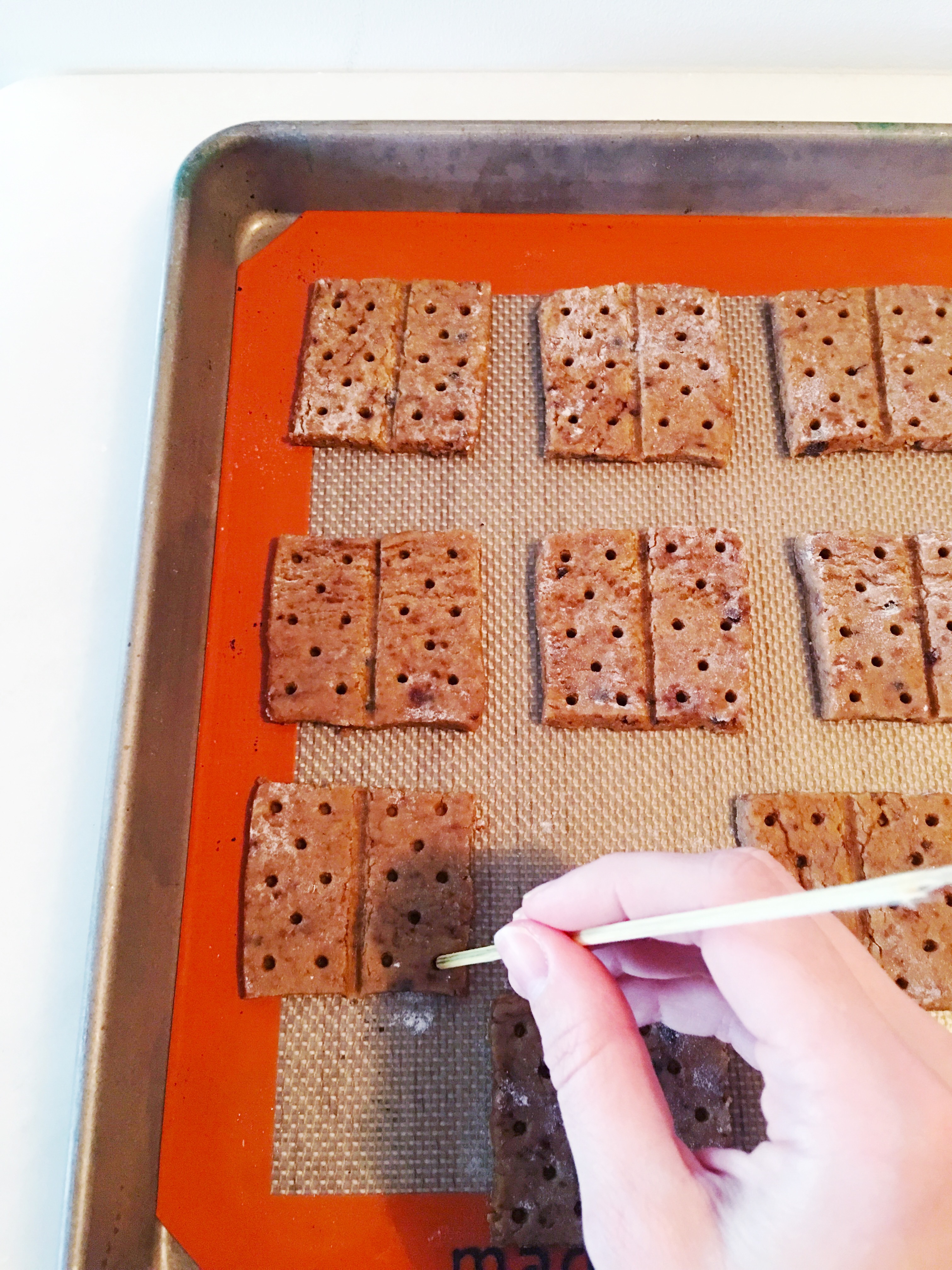 11. Remove the tray from the fridge and, using a toothpick or skewer, create the pattern found on a typical Graham cracker on each square. (A line dividing the square in half and then alternating rows of 2 dots and 1 dot on either side of the line.) You don’t want to go all the way through the dough with the skewer, but you do want the lines and dots deep enough that they will remain even after the crackers have baked and risen slightly.