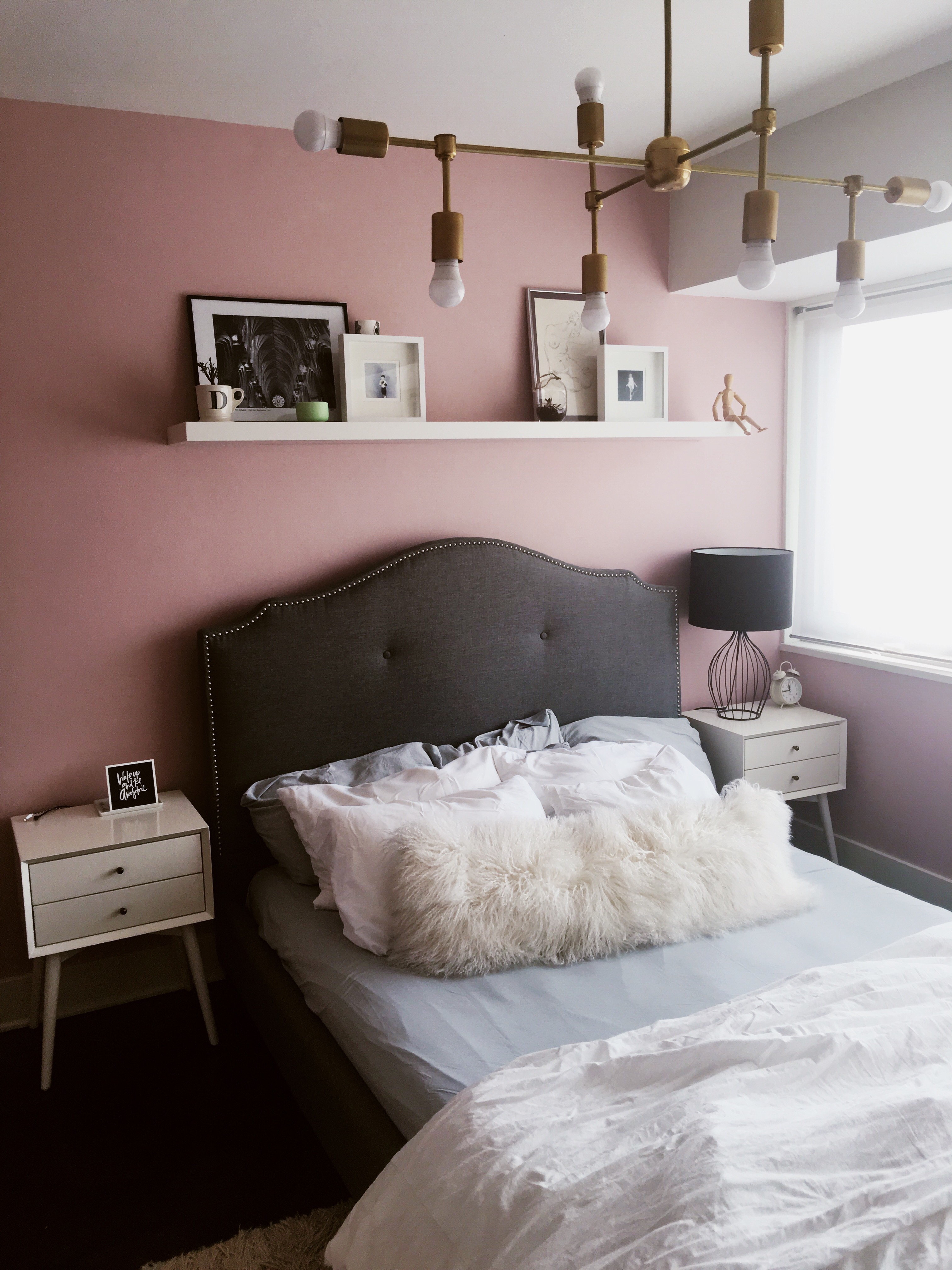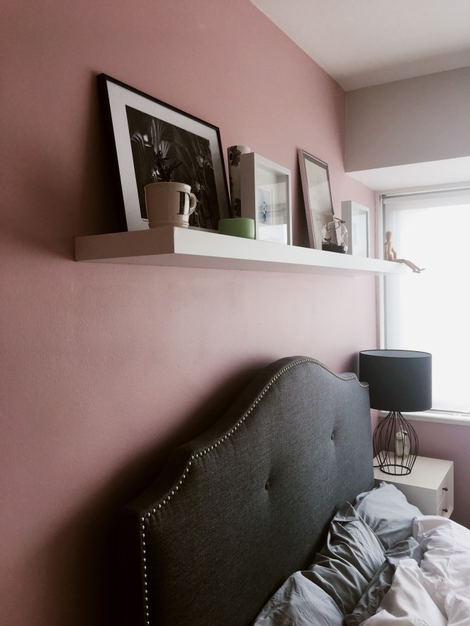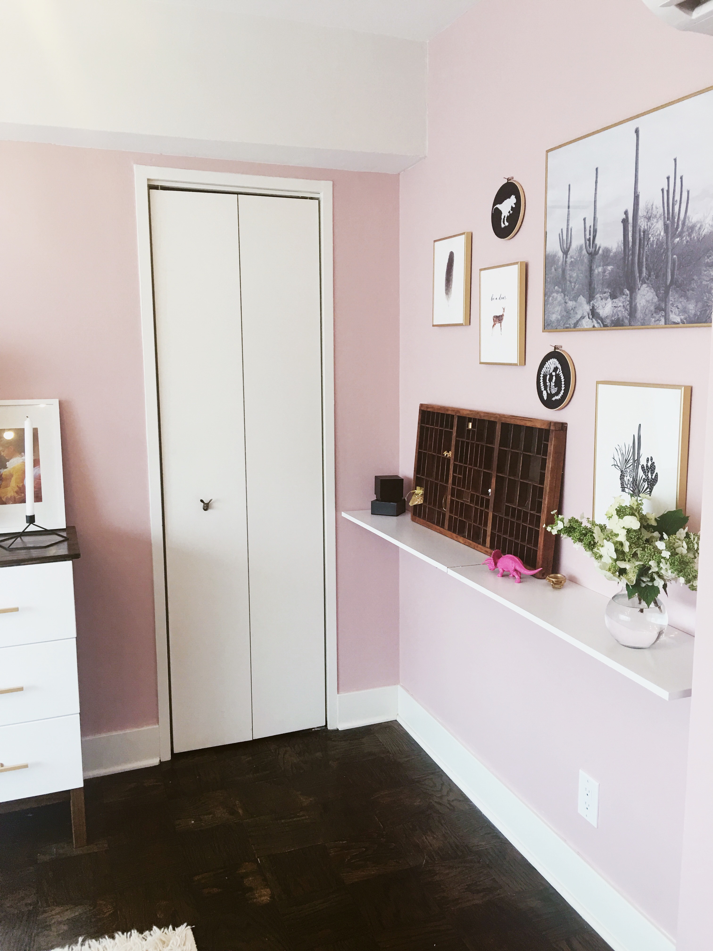 I’m so pleased with how the room is coming along! That wall with the haphazard shelves (a real DIY fail and a story for another day), is meant to become the wallpaper accent wall, but I’m thinking of nixing it altogether now that I see the pink on all four walls. What is happening in the near future is we will be replacing those ugly shelves with a small, narrow desk and chair, and turning that area into my vanity.