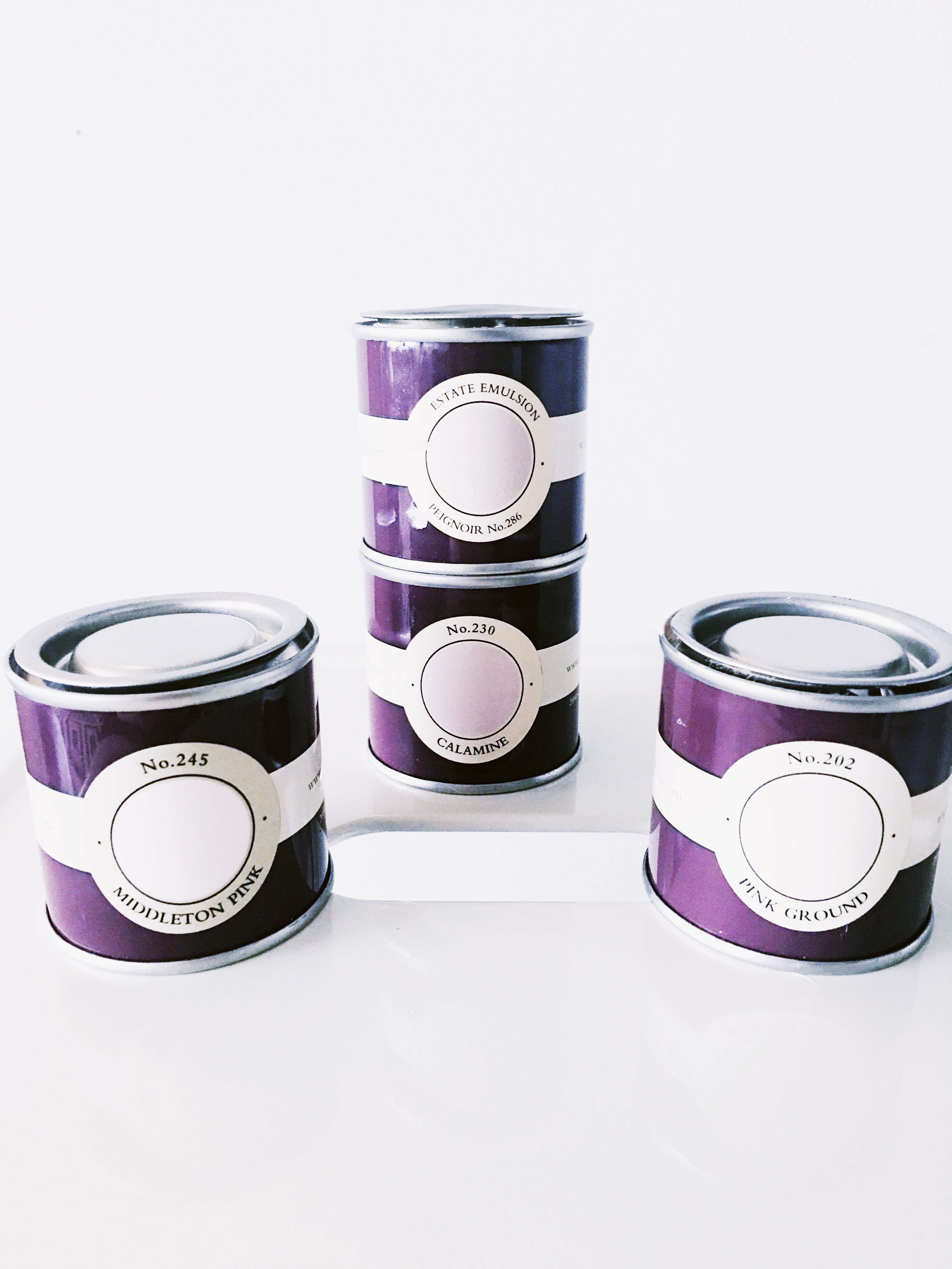 I’ve been planning for months to paint the bedroom pink, but, as with most of my DIY projects, I have really, really good intentions and less than perfect follow through. So, in a moment of ambitious motivation, I went to the Farrow & Ball showroom here in D.C. and picked out a few samples that caught my eye.