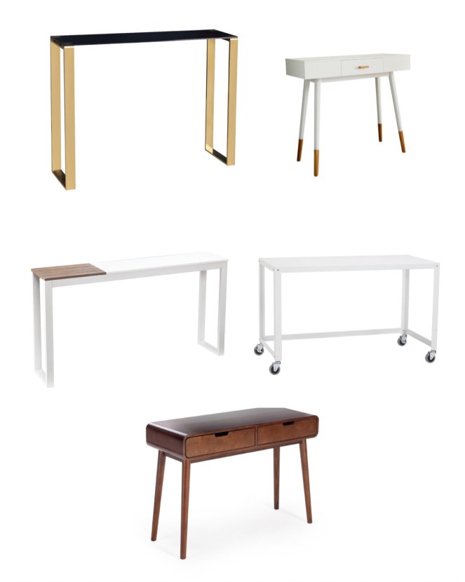 Clockwise from top left: Remini Narrow Console Table, Euro Console Sofa Table, Go Cart White Rolling Table, Mid Century Modern Console Table, Lydock Console Table